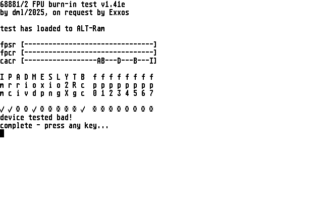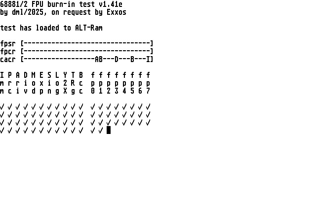 FPUTest runs the full 68882 instruction set & condition codes against a set of known good expected results. This is done by computing a hash from running results and verifying the final hash against a saved recording. New recordings can be created from real hardware.